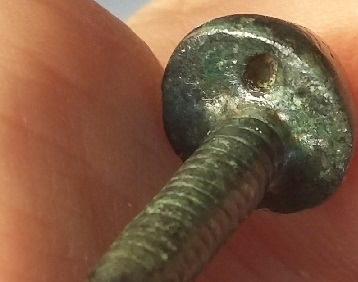 Selon Andouze / Courtois , groupe Q , epingle à tete vasiforme , 4 eme sous type caracterisé par un sommet bombé et debordant , N°356 , ici elle a la particularité d etre perforée , Bronze final , une epingle perforée a ete retrouvé avec un anneau en fil de cuivre dans cette perforation arvi