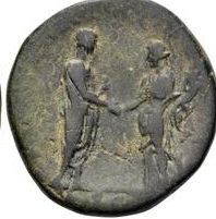 En ce qui me concerne , je pense à un sesterce de Hadrien au revers FORTVNAE REDVCI, Hadrien drapé debout , donnant la main droite à la Fortune, drapée, debout .