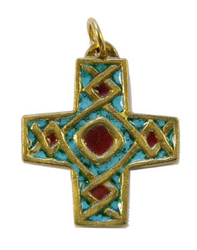 Petite croix de forme grecque avec 4 bras de même longueur, décorés de cabochons de différentes formes, sertis et émaillés, le long des bras.''