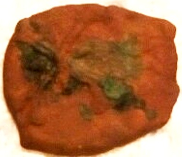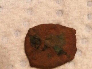 par contre ce qui est bizarre c'est qu'on dirais qu'elle est en terre cuite,sûrement à cause du temps que elle a du passé au bord de l'eau,je pense en cuivre.