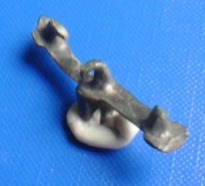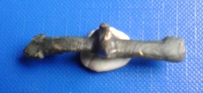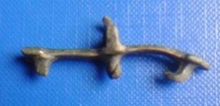 Voici un objet en bronze, 3,9 cm de long. D'un côté nous avons une bélière cassée et de l'autre côté nous avons 3 crochets dont 1 cassé.