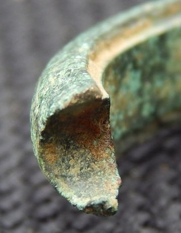 Trouvé hier en labours Beauce 41 ce petit anneau pur bronze de 43 mm au plus large. Posé à même le sol ! Les extrémités enserraient peut être quelque chose, il y a en effet des stries sur une d'elles, mais pas sur l'autre ...poids 13.8 g merci si vous avez une idée et bon apéro du samedi soir !