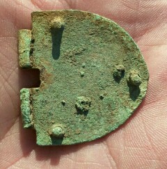 Peut-être un élément de boucle ou reliure de livre, je ne sais pas...il reste les rivets et de la dorure...