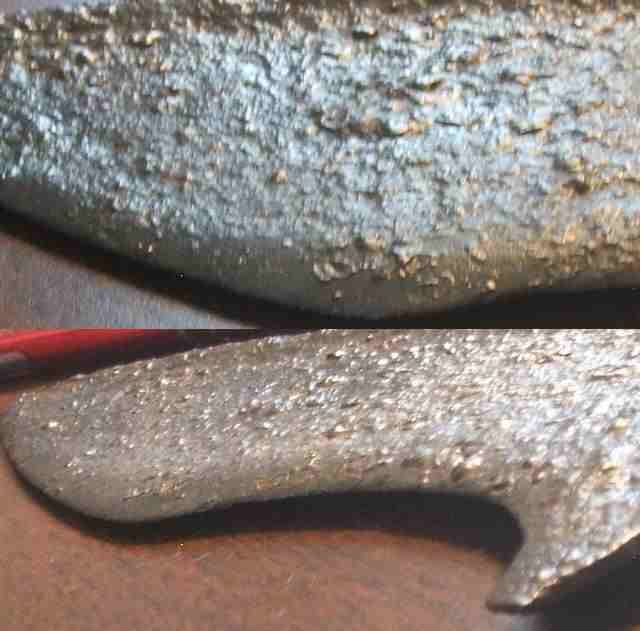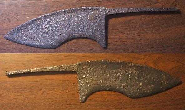 pour did77 , j'ai juste fait pour l'instant un simple ponçage à la rotative souple , la lame est tres saine , encore plus au niveau du tranchant ce qui est surprenant comme tu peux le voir , je ferai ensuite une électrolyse apres avoir enlevé les cloques et la le plus dur reste à faire ... le netoyage pour enlever le plus possible de 'sel ' lié à la solution électrolytique , le passage 'aux braises' pour déshydrater l'acier ( le + important ) , huile fine et reponçage et j'attends plusieurs mois pour voir comment réagit l'artefact , retraitement des parties qui continuent de rouiller etc....et la seulement je mets du paraloid incolore .... y a du boulot !!!