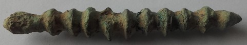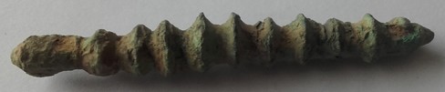 Je soumets à votre sagacité cet objet long de 65 mm et d'environ 10 mm de section au plus large. Il n'est pas fileté. Difficile de se rendre compte s'il y a cassure aux extrémités.