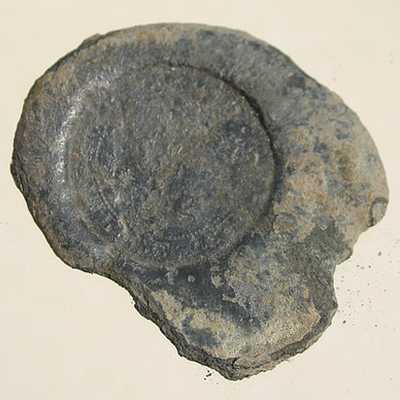 Pet être une monnaie, qui a été frappée sur un morceau de plomb pour en faire une empreint? ou pour en faire un palet de jeux??