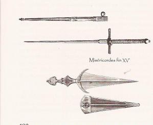 Il s'agit peut-être d'une Miséricorde,sorte de dague à section carrée(parfois) que l' on passait par un défaut de l’armure au niveau du gorgerin. C'est un couteau qui ne pouvait être utilisé que quand les combattants étaient très rapprochés et lorsqu'on avait renoncé à se servir de l'épée.Elle servait aussi à achever les gisants sur le champs de bataille.C'est aussi une arme de chasse pour achever la proie au niveau de la carotide.