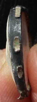Il mesure environs 20 mm sur 15 mm et pèse 2 gr. Il est cerclé d'argent