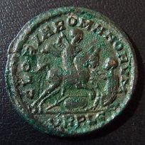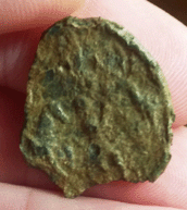 Je sais qu'elle est dans un état lamentable mais malgré tout on distingue comme un personnage avec les bras en l'air sur cette vieille monnaie cassée. L'autre coté est inexploitable…