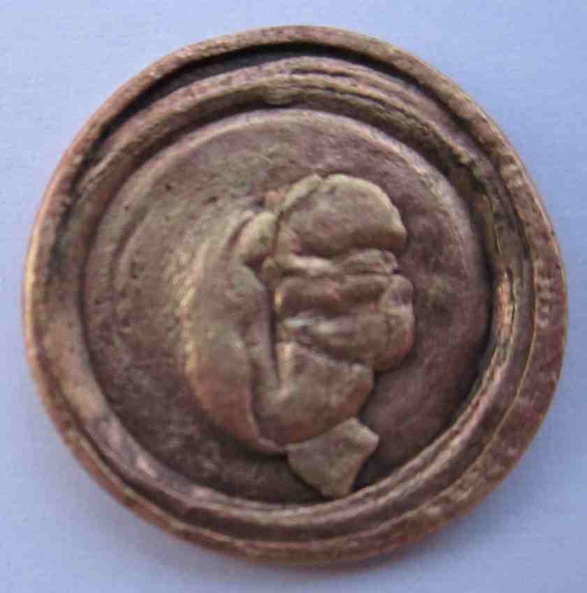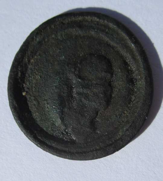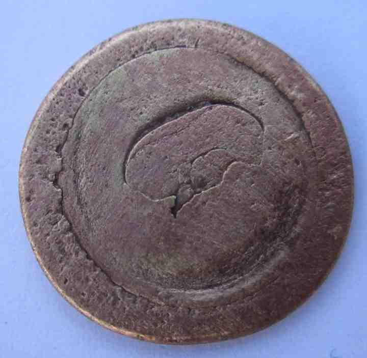 Je pensai que cette face R2 complètement écrasée serait le devant du bouton ,que le motif en relief est ressorti derrière en R0 et qu'il manque la contre plaque (sertie) du bouton avec son attache.