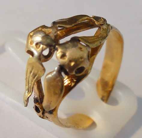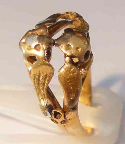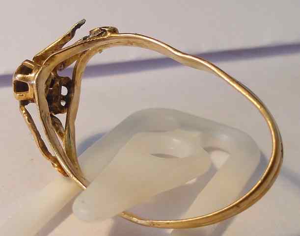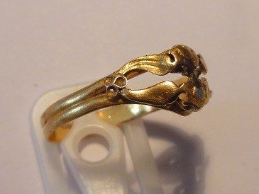 Cela fait quelques semaines que j'ai cette belle bague en or de 2,5 gr ! je l'ai trouvée en labour. Elle est superbement travaillée et me parait pas toute jeune, elle a souffert du temps !! est-il possible de dater un bijou pareil ? Elle n'a aucun poinçons visible....Merci aux pros de l'identification, si ils ne sont pas partis en weekend ...