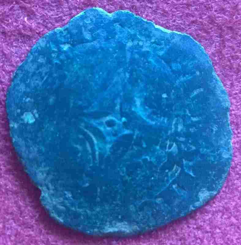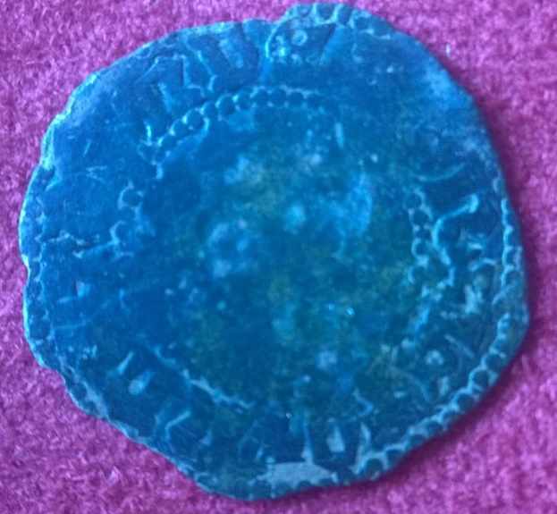 Je n'ai aucune identification à te proposer mais ta monnaie est datable de la toute fin du XIV ème ou bien du XV ème siècle. Elle peut être royale ou bien féodale. La croix est effectivement fleurdelisée et formée sur un losange curviligne. Tes photos sont grandes et nettes mais peut-être qu'on y gagnerait encore en lisibilité si tu en prenais de nouvelles en lumière naturelle (à moins que ce ne soit déjà le cas). Côté pile je pense qu'il faut tourner la monnaie d'un quart de tour sur la gauche. Je crois y lire : +?A...M...H/RDE...H/R.