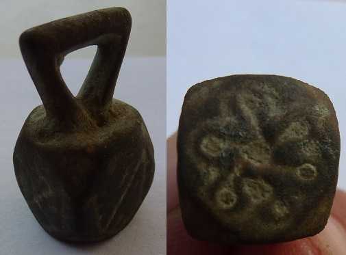 voici un petit poids énigmatique il est décorer sur toutes ces faces y compris le dessous.