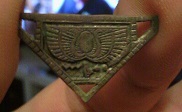Genre poisson ou serpent ailé avec couronne sur une face et sur l'autre face un ovale entouré de deux serpents et des ailes.