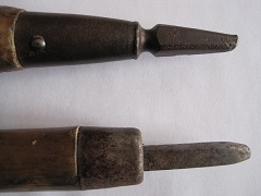 Ce morceau de pointe en métal ressemble à un embout de canne de marche en bois (photo ci -dessous l'embout du haut) ou de canne de bois ferrée dite 'canne d'officier'. Les cannes de marche en bois étaient souvent sculptées et décorées et possédaient un embout en métal de cette forme. Ce n'est qu'une hypothèse bien sur.