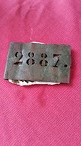 Fortuité dans un labour du 29 cette plaque avec les inscriptions 2887 B mais surtout avec un bout de coquille saint jacques enchâssé dedans aux mêmes dimensions!
