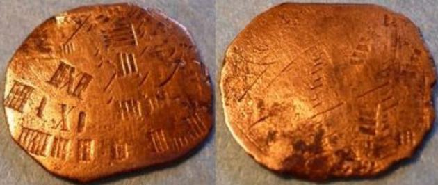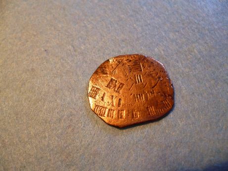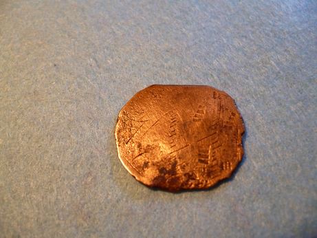 Quoique ...sans doute une rondelle, ancienne monnaie ou pas, utilisée pour tester des poinçons de marquage ; d'ailleurs, vu la régularité, certains traits me font penser à des empreintes de roulettes mécaniques