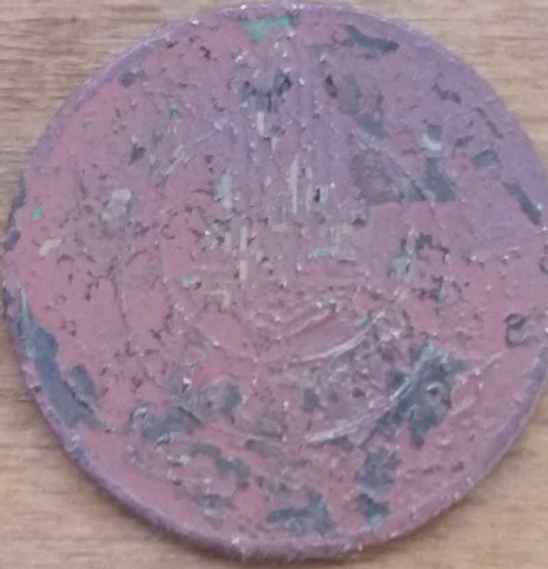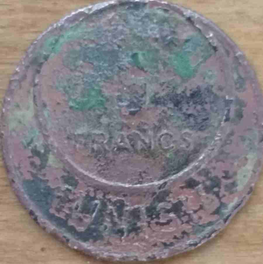 En voici une autre dont je me demande si il s'agit d'une vraie monnaie ou d'une pièce de jeu. Sa valeur est de 5 francs, mais je ne parviens pas à déchiffre l'inscription en dessous. Peut-être pourrez vous éclairer ma lanterne....