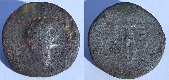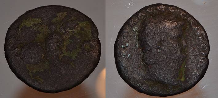 je me demande s'il ne s'agit pas d'une monnaie de Domitien avec Minerve au revers , il me semble que l'on voit un reste de bouclier en RO , et la légende autour du personnage commençait par TRPCOS et ce qui expliquerait aussi ce qui semble être un V derrière la tête de l'empereur
