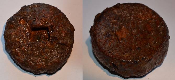 Voici un palet ferreux de 45 mm de diamètre. Le dessous a une surface concave. Le dessus a une ouverture rectangulaire et il est creux.