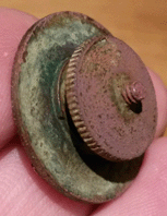 Voici une sorte de bouton avec des fusils croisés. Je dis une 'sorte' car l'arrière me parait curieux pour un bouton. Ça ressemble plus à un rivet avec comme une roue dentelée derrière. Diamètre 25 mm. Forêt Meurthe-et-Moselle.
