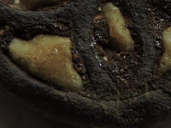 après nettoyage sous la bino , un joli motif m est apparu , et surtout des restes d émaux blancs !!!! vu les vestiges d attache , je pense a un bouton , mais,,,,