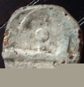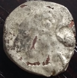 Voilà une petite obole fourrée trouvée dans une pente remblayée de nos collines de la Yaute. Elle était, au bord d'un très maigre cours d'eau, en compagnie de quelques autres monnaies romaines de diverses époques dans un état peu heureux. Je penche vers une imitation d'obole tolosate à tête négroïde.