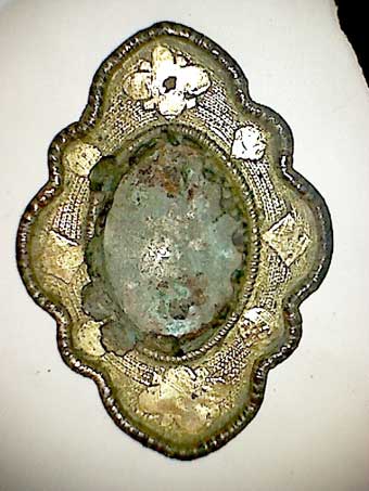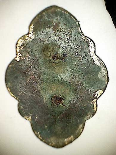 après plusieurs recherche de ma femme sur le net il semblerait bien que ce soit un objet de reliquaire(ou crucifix) phylactère ou quadrilobe religieux du 14 e. très répandu dans le Berry et le limousin,d'ailleurs objet trouvé dans le secteur de Châteauroux.