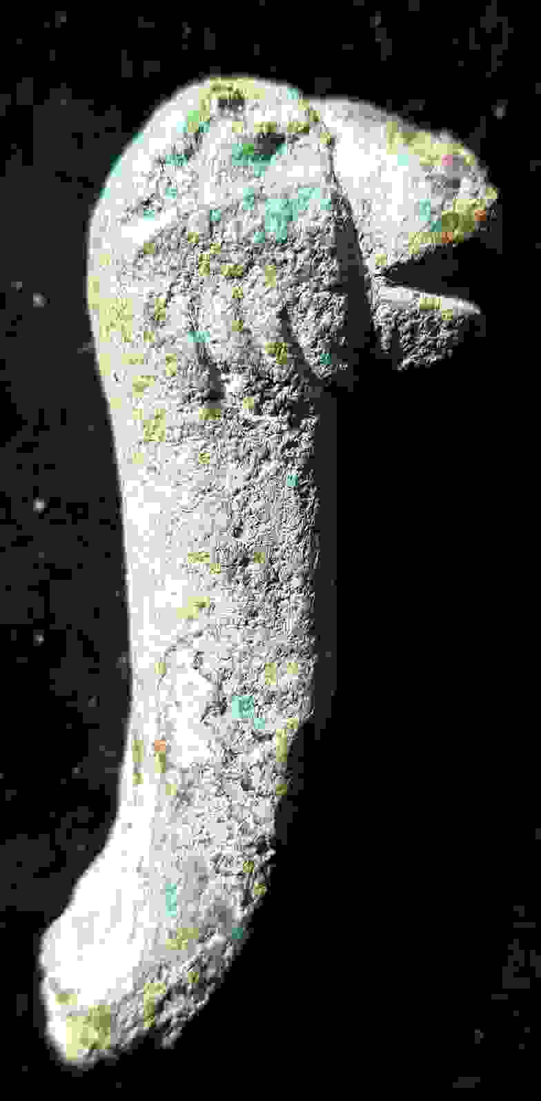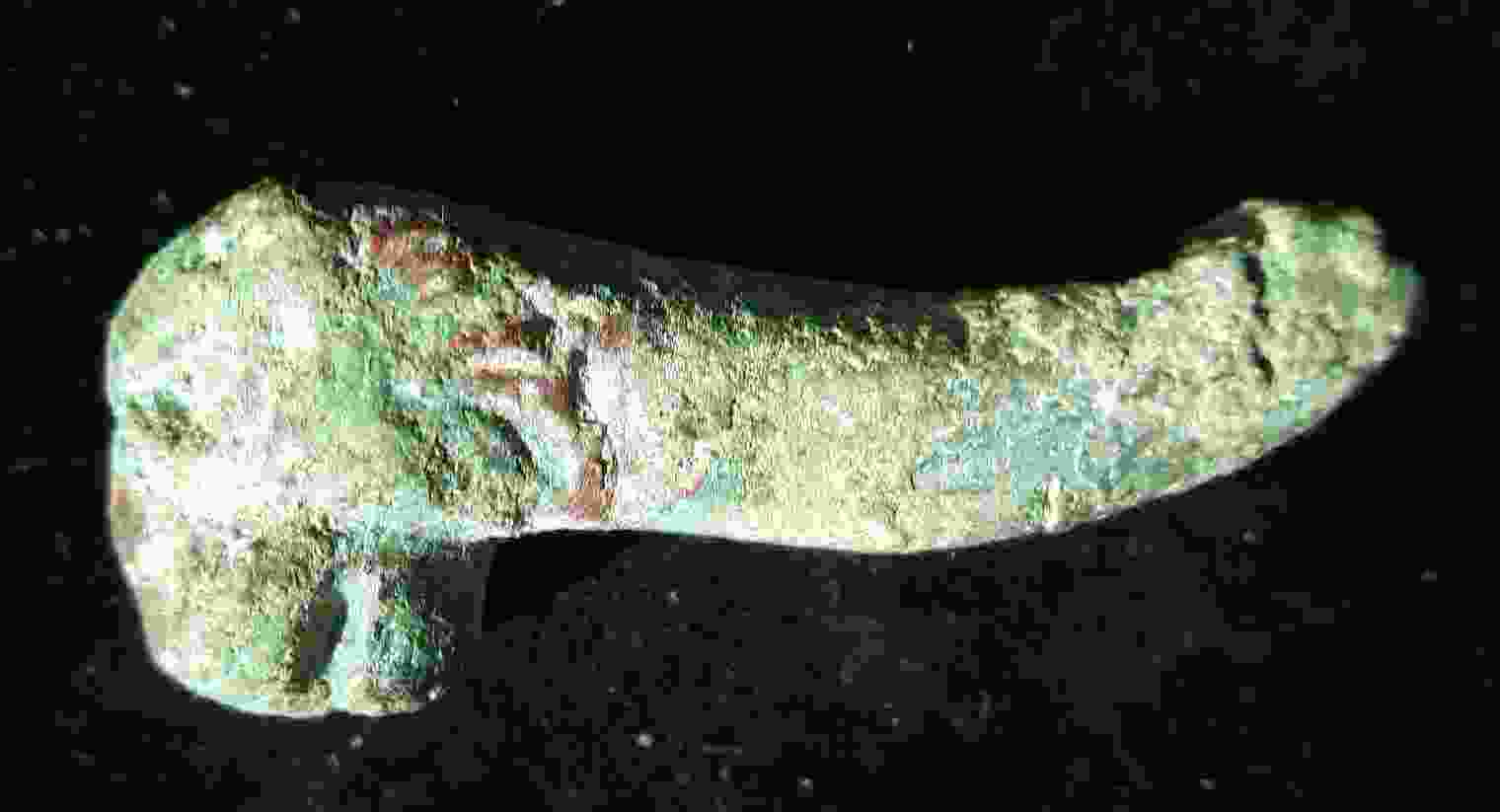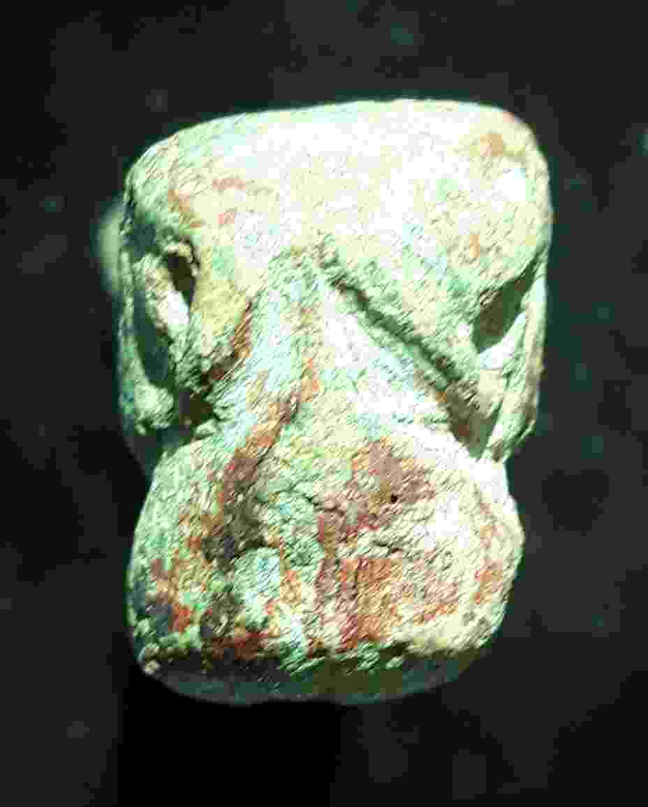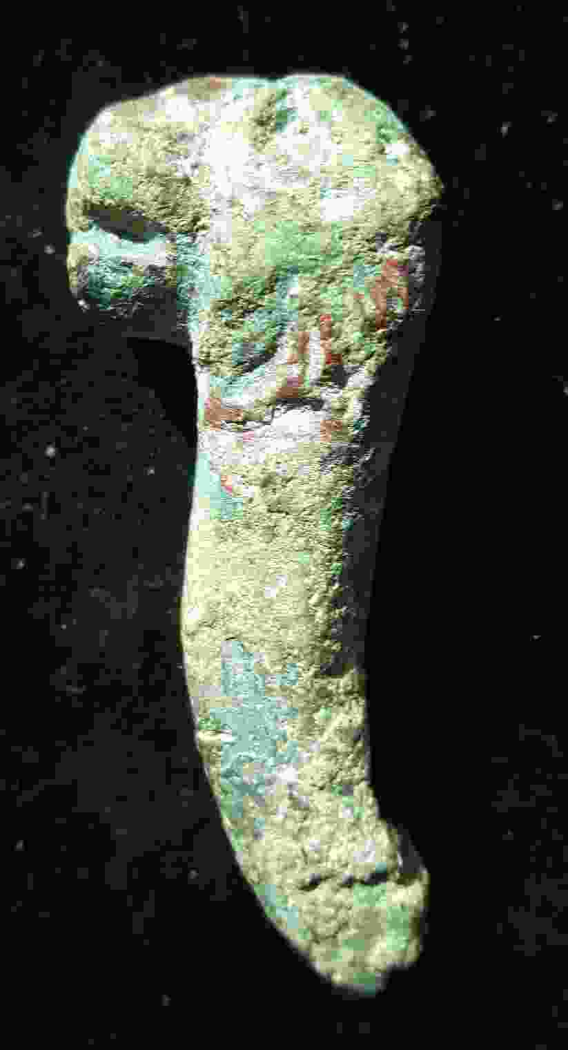Bon, au risque de passer pour l'obsédée de service (la qualité de la photo n'est pas top, j'ai des circonstances atténuantes !), si on tourne la photo comme ceci, j'y vois une amulette romaine zoomorphe certes d'un côté et phallique de l'autre. Je ne sais pas si ça existe, je sais juste que les amulettes phalliques romaines pouvaient présenter un autre motif (main, ailes...) en plus de 'l'objet du délit'.
