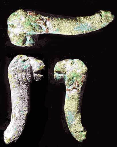 Pour moi : objet zoomorphe Romain ( ce doit-être une tête de bélier ).