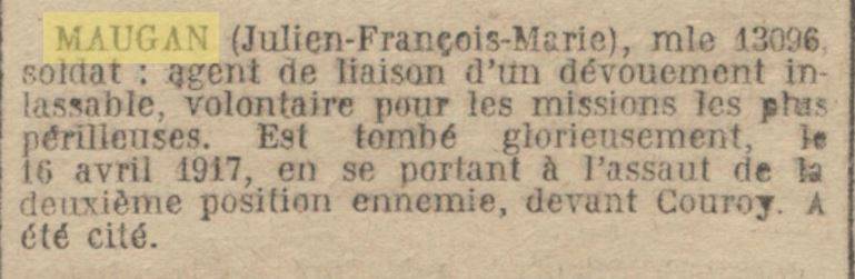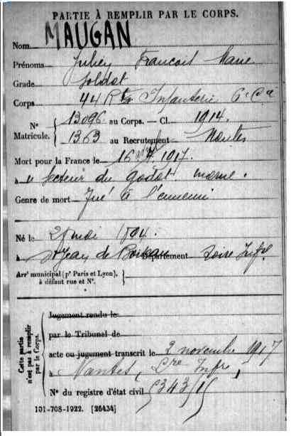 Voici les résultats des recherches : Les Parents de Julien s'appelaient MAUGAN Julien Marie et ROBLOT Madeleine Françoise ; Julien est né le 28 Mai 1894, et avait 3 frères ; 2 sont morts en bas âge, le 3ème, Constant, est mort le 16 Septembre 1915 par ' blessures de Guerre ' !