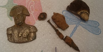 Hier, j’ai découvert quelques objets intéressants dans un champs en Normandie dont celui-ci qui représentant un buste, sauf erreur de ma part, de Napoléon 1er. Derrière l’objet il y a un « S ».