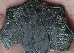 Je pense à un bouton enseigne représentant saint Mathurin à droite sur l'image repositionnée semble t'il on voit une paire à de ceps (menottes pour les fous). Saint Mathurin était censé guérir les fous et les possédés., en plus on voit RIN..