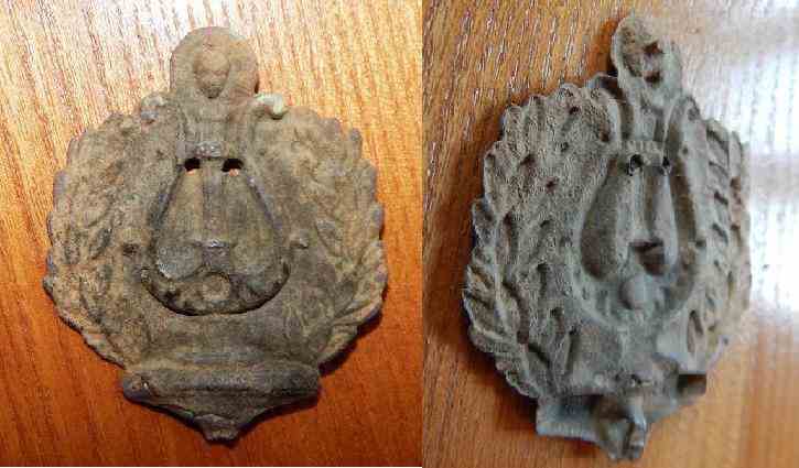 Petite sortie de cet après midi, J'ai trouvé cette plaque en forêt Lorraine ; Apparemment il s'agit d'une plaque de Giberne de musicien,