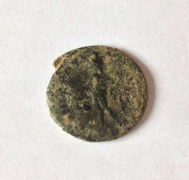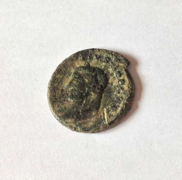 une petite monnaie , romaine je pense, j'ai pas osé la nettoyer davantage pour ne pas enlever sa patine. Une identification est elle quand même possible?