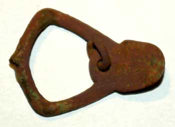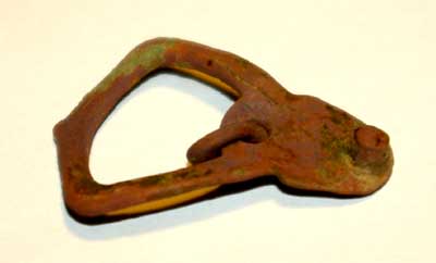 boucle à chape intégrale et rivet coulé... médiévale...mais plus du haut moyen âge avec son repose ardillon débordant, boucle d'épéron bien sûr.