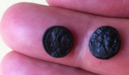 Le style du profil parait grecque. Elle parait un peu épaisse. Peut-être est-ce une gauloise ? Tu as trouvé les deux ensemble ? Avec une patine noire, elle est peut-être en argent. Ou c'était une monnaie en bronze à l'air libre.