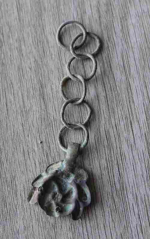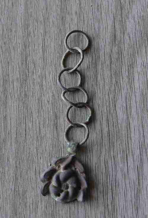 la chaine servait de réglage et fixation sur une 2ème fleur cousue de l'autre coté du col et les petits trous dans la fleur servaient à la coudre sur le tissus