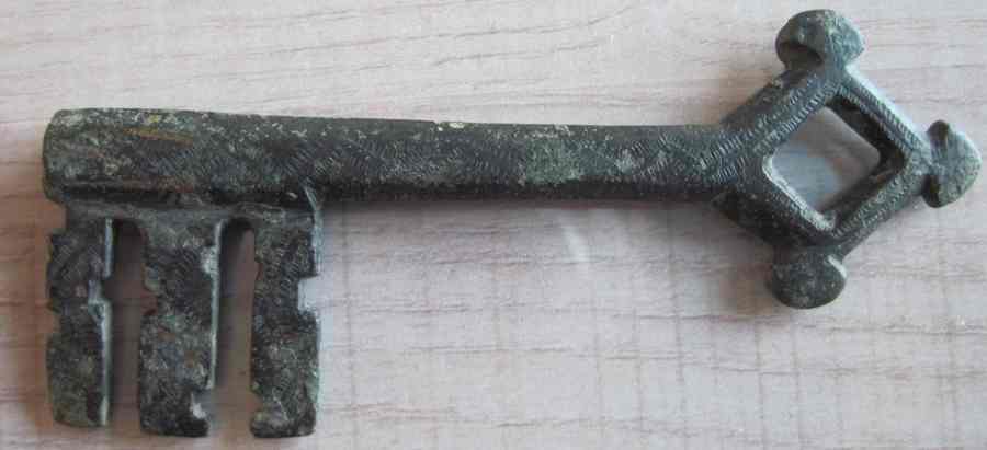 Magnifique clé bénarde, plutot du XIIIe siècle , avec anneau original et tige et panneton décorés de stries. Après recherches sur le net, il pourrait s'agir d'une clé de sacristie, ou de tabernacle. Mais quant à l'usage, bien sur, sans aucune certitude.