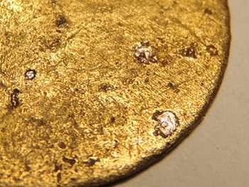 j ai donc gratouillé la face mise en ID en R1, la plus ''tachée'' , j ai refais un cliché sous lumière artificielle , ( pas top) , donc un petit coup de bino et aiguille , juste un peu de concretions genre terre fine , puis le métal bien jaune aussitot , et très brillant ! donc monnaie en bon or, le bijoutier ne s est pas trompé,,,,il s agit apparemment de défauts de surface ,,,peut etre du a l extrème usure ?