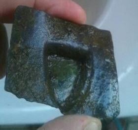 Après une petite sortie cet aprem, j'ai fortuité ce drôle d'objet plaqué or. L'objet en question (une sorte de plaque) est cassé (pas trouvé l'autre partie), et il y a ce qui ressemble à un blason (par la forme) en relief. Une petite boule 'd'attache' est présente en haut de la plaque.