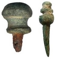 pour moi clou décoratif romain en bronze (à gauche) ou éventuellementvu la tige et la partie supérieure en forme de bobine applique en bronze à clouer de char romain (à droite)