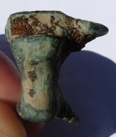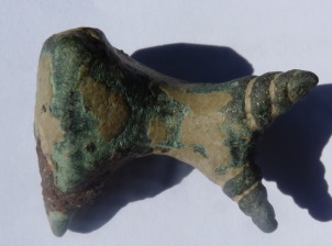 Voici un petit objet qui m'intrigue vraiment je ne sais pas ce qu'il représente(on dirait un escargot avec les cornes) ni a quoi il pouvait servir(il y a un restant de rouille).Je m'en remet donc à votre savoir .