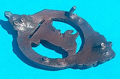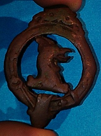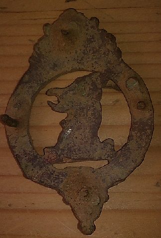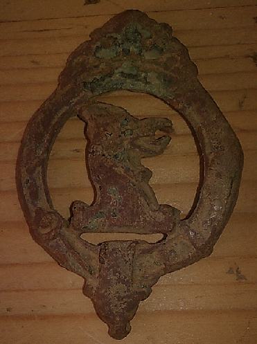 Dans le numéro 76 de ''Détection Passion'', en page 19, il y a un objet identique au tien à un détail près: la bestiole regarde vers la gauche cette fois! Donc je pense qu'on peut oublier le côté ''armoiries / blason / insigne'' et chercher un objet uniquement décoratif...