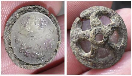 J'ai trouvé cet objet hier dans un pré à vache. On dirait un chaton de bague ou il manque l'anneau. La pierre semble être du christal de roche ou de la pate de verre. Elle est gravée en creux comme les bagues à intaille romaines. Cela dit, je la vois plutôt du XVIIIe.