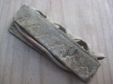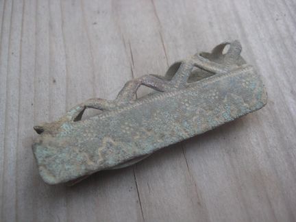 J'ai trouvé dans un coteau de l'Aveyron cet objet en bronze ( passant ) qui mesure 50mm de long et 18mm de large, mais qui me semble plié, donc peut-être un passant, mais de quelle époque ?