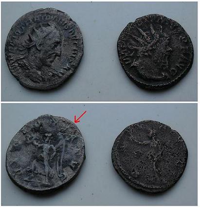J'ai un antoninien de gordien sur lequel y'a un petit pèt, et un voit nettement du bronze en dessous et de l'argent ou du billon dessus.