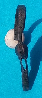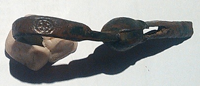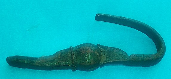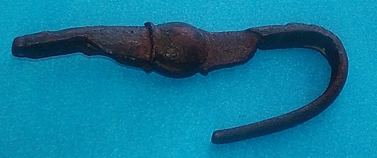 Petit crochet (57 x 22 mm) trouvé ce matin dans un champ fraîchement déchaumé de Beauce. On dirait que les 2 extrémités pourraient pivoter sur un axe qui serait dans la boule , à vérifier...