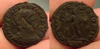 Follis réduit Constantin Ier A/ IMP CONSTANTINVS AVG, buste lauré drapé et cuirassé à droite, R/ SOLI INVIC-TO COMITI, Soleil radié debout à gauche levant la main et tenant un globe, T/F dans le champ (TEMPORVM FELICITAS), PTR à l'exergue – Trèves
