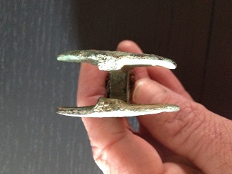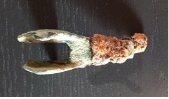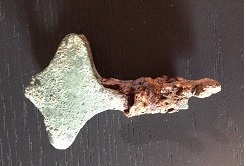 j'ai trouvé cet objet qui fait 7cm de haut par 4.5. un 'truc' en cuivre(?) sertit à un 'manche' en fer par du fil de fer bien serré. je vous joins 3 photo si vous avez des idées:)